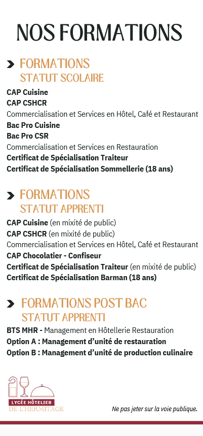 Le lycée Hôtelier de l’Hermitage, labellisé "lycée des métiers de l’Hôtellerie, de la restauration et du vin" a acquis définitivement ses lettres de noblesse. Il existe entre notre lycée et le monde professionnel, une confiance réciproque, fruit d'années de travail et d’investissement.